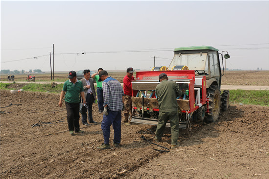 在作业现场,中心技术人员认真仔细查看了2BD—8型旱田滴灌水稻播种机在播种、施种肥、镇压、自动填埋节水滴管等环节,重点查看了机具作业时播行是否直,趟间距是否一致,播量是否均匀,是否有漏播和重播现象以及节水滴管口位置是否与种子的位置相对应等技术细节。