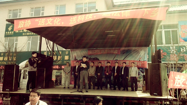 2015年4月26日,安图县农机总站积极响应安图县政协的号召,由周兆胜局长带领相关科室工作人员,参加了松江镇“科技、文化、法律”三下乡活动。