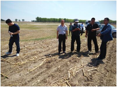 至5月21日,洮南市承担实施的秸秆全覆盖保护性耕作任务面积免耕播种作业全部结束,陆续发芽出苗,图为市农机局局长孙春来及分管领导带领技术人员踏查播种后的保护性耕作地块。