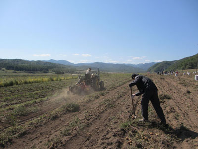9月14日,安图县政协副主席李迎春一行在县农机局周兆胜局长的陪同下,来到石门镇南柳村现场查看马铃薯起获情况。 据种植户刘晓东介绍,他今年共种植马铃薯23公顷,从点播到起获全部使用机械作业,马铃薯点播机、起获机操作简单,播种均匀,起获干净,大大减轻了过去种植马铃薯使用劳动力多,劳动强度大,劳动时间长的问题。 据了解,安图县马铃薯的种植面积有近千公顷,主要集中在石门、亮兵两乡镇,这几年在亮兵新安、汇财手拍粉丝厂的带动下,种植面积逐年扩大。早在2011年,县农机局采取有效措施,积极引进先进的马铃薯种植、起获机械,向广大马铃薯种植户进行示范推广,填补了安图县无土豆种植、收获机械的空白。通过几年来的推广普及,目前马铃薯种植、收获已基本实现了机械化作业。
