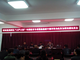 2015年10月27日下午,在农机局五楼会议室召开农机局深化“三严三实”专题教育专项整治基层干部不作为乱作为等问题动员会,局机关及所属三家事业单位共50余名党员干部参加了会议。副局长许明主持会议。 会上,党办主任张彦军同志宣读了《双辽市农机局深化“三严三实”专题教育专项整治基层干部不作为乱作为等损害群众利益问题的实施方案》,局长冯彦林做了重要讲话,并就专项整治有关工作提出了三点意见:充分认清开展专项整治的极端重要性,切实增强巩固党在基层执政根基的强烈忧患意识和责任意识;精准把握开展专项整治的基本要求,依法依规解决基层干部损害群众利益问题;坚持把严和实精神贯穿专项整治全过程,确保整治工作重点任务落地见效。副局长许明要求局属三家事业单位要立刻传达学习会议精神,并及时对专项整治工作进行安排部署,要切实抓好专项整治的组织实施。